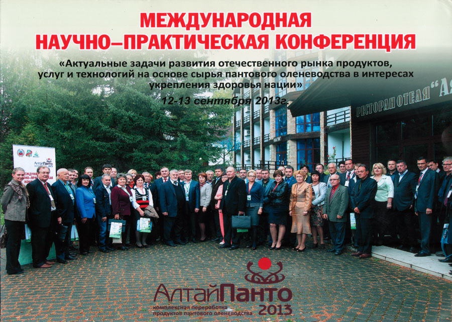 В Алтайском крае 12 и 13 сентября 2013 года в парк-отеле «Ая» была успешно проведена международная научно-практическая конференция «Актуальные задачи развития отечественного рынка продуктов, услуг и технологий на основе сырья пантового оленеводства в интересах здоровья нации». В конференции приняли участие российские ученые и практики из Москвы, Новосибирска, Томска, Барнаула, Бийска, Горно-Алтайска, Белокурихи, гости из Испании, Южной Кореи, Казахстана. В подготовке и проведении конференции участвовали также сотрудники ГК «Пантопроект». С одним из основных докладов «Актуальные вопросы переработки продуктов пантового оленеводства на Алтае» выступил руководитель ГК «Пантопроект» к.э.н. Фролов Николай Алексеевич. На конференции приняли участие также представители из Барселоны Ольга Жукова и Анжел Колетес, представители компании «CAMZHU BCN S.L.» Они рассказали о своем опыте работы по сертификации продукции ГК «Пантопроект» в странах Евросоюза.